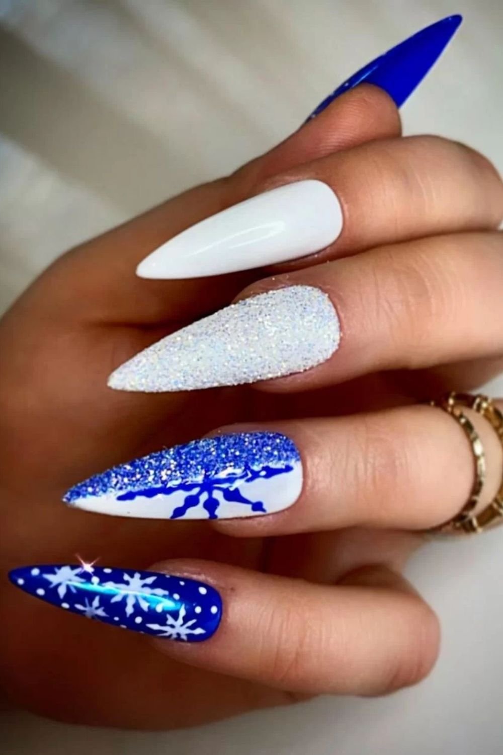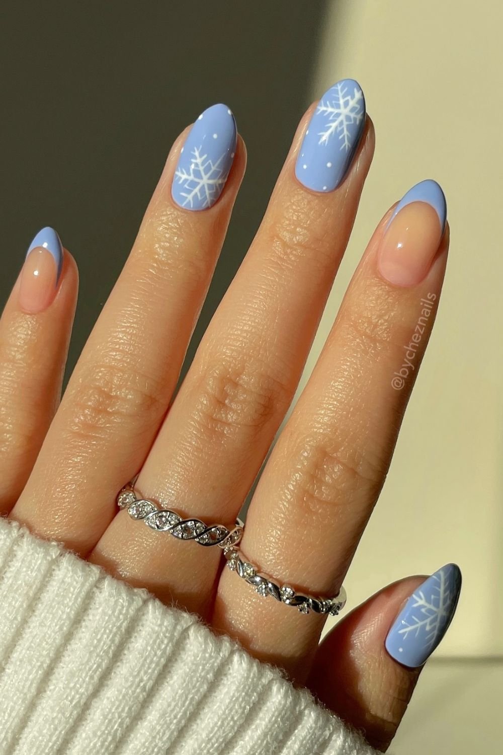 Snowflake designs on blue nails are a winter classic. Whether hand-painted or stamped, snowflakes instantly create a festive winter manicure.