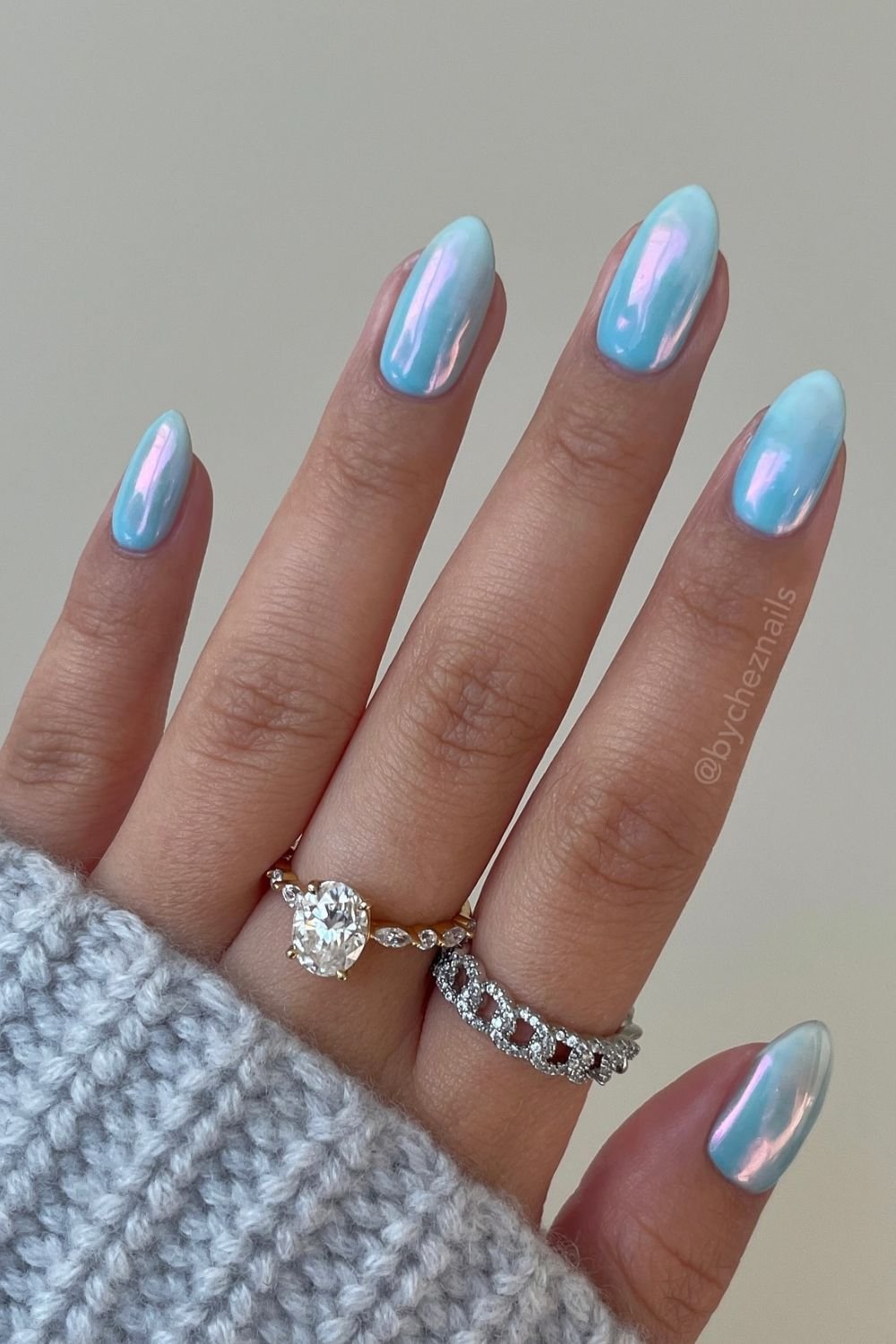 Blue chrome nails reflect light beautifully and create a futuristic winter look. This metallic finish is especially popular for winter fashion-forward styles.