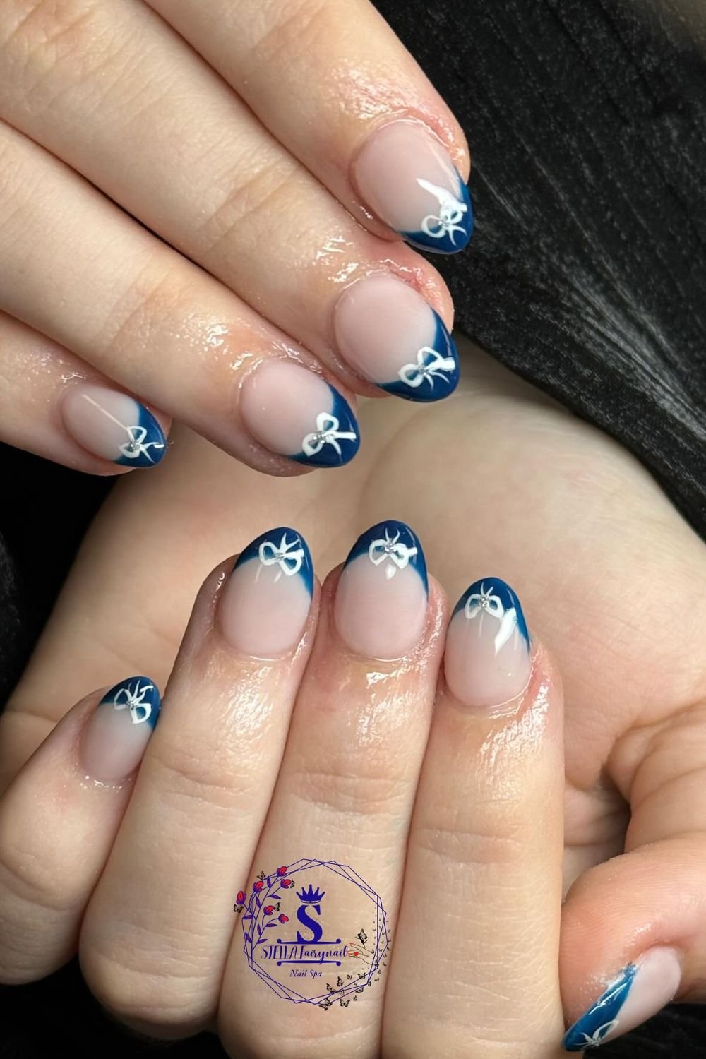Blue ombré nails blend lighter and darker blue shades to create a smooth gradient effect. Popular combinations include icy blue fading into navy or white.