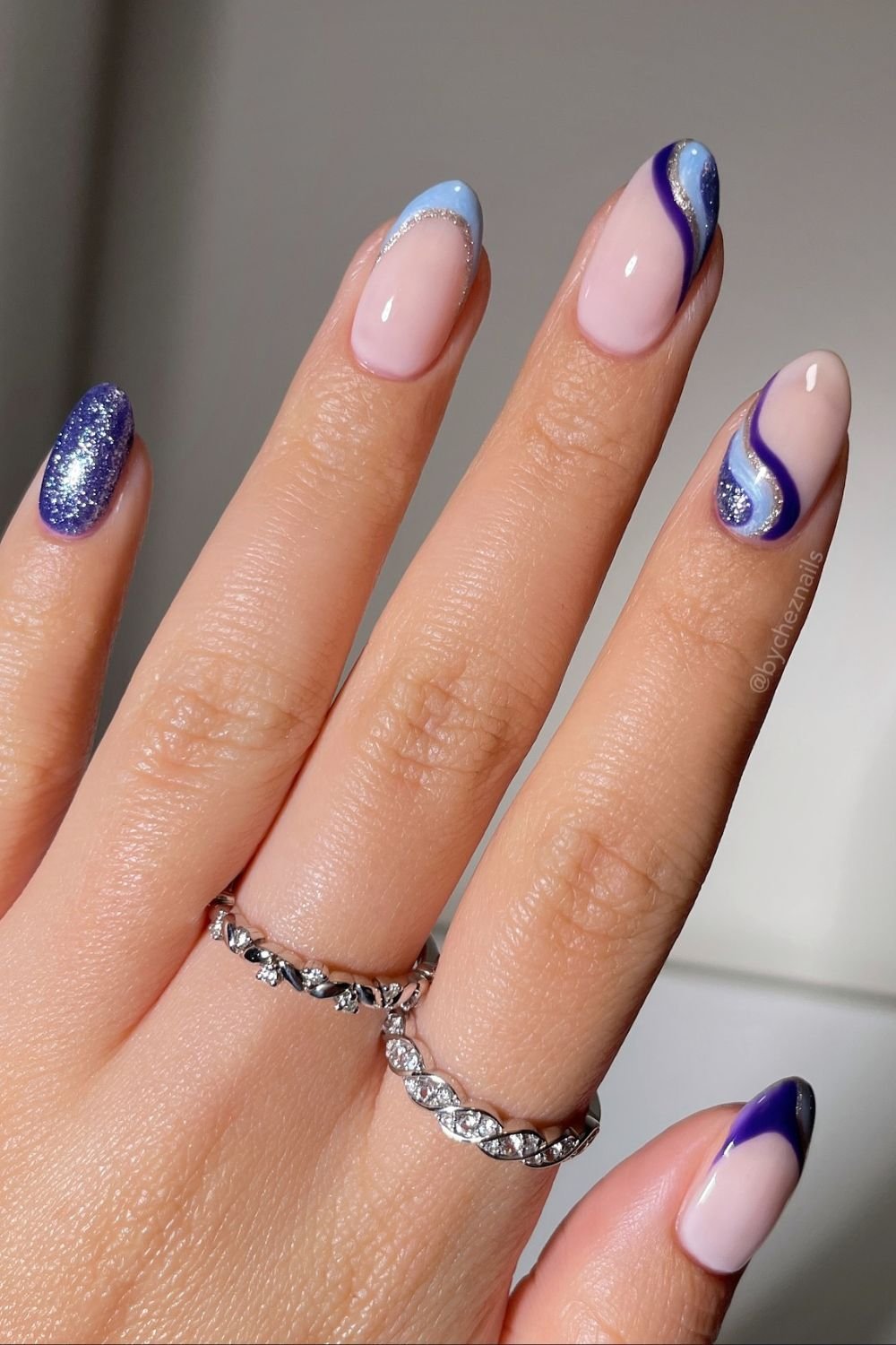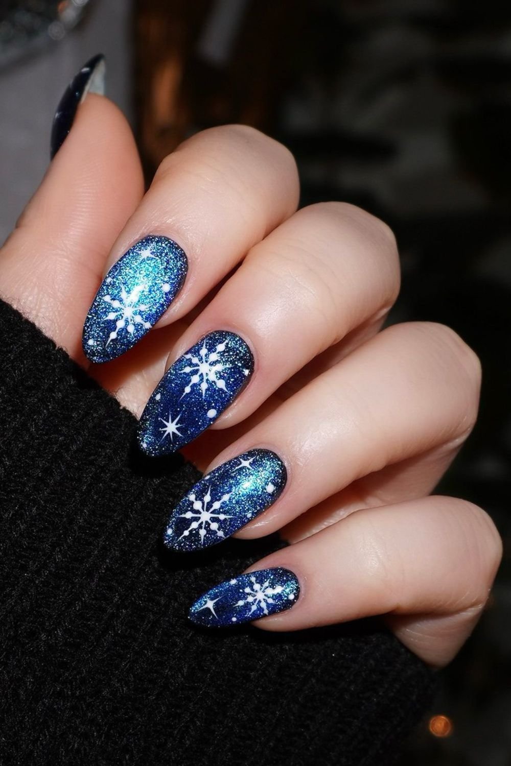 Dark blue nails with glitter accents add a festive and glamorous touch. Glitter tips or full-glitter accent nails are perfect for winter parties and celebrations.